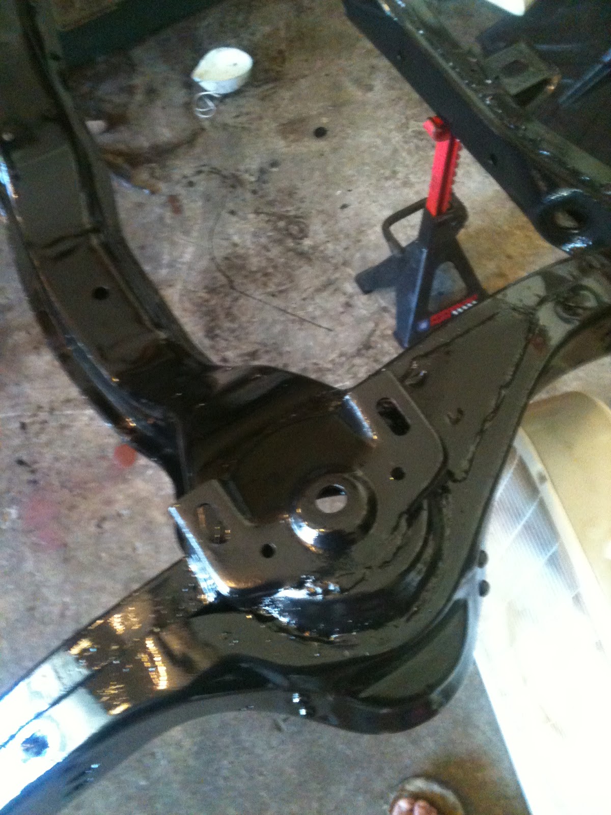 I will be spending time tomorrow to finish scraping and grinding on the front 1/3 of the frame. Once this is complete and sealed, I will be pulling the frame out of the garage again to spray reformer into the inside of the tube frame.
